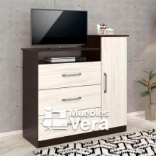 Modelo: Montevideo Material: melamina de 18mm. Medidas: 99 cm de altura total 91 cm largo total 46 cm fondo Con 04 cajones con sistema corredizo telescópico Con 01 puerta con sistema batiente Con jaladores de metal Con fondo de mueble en MDF